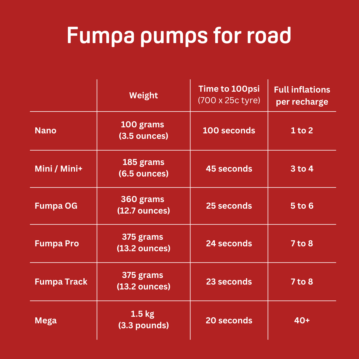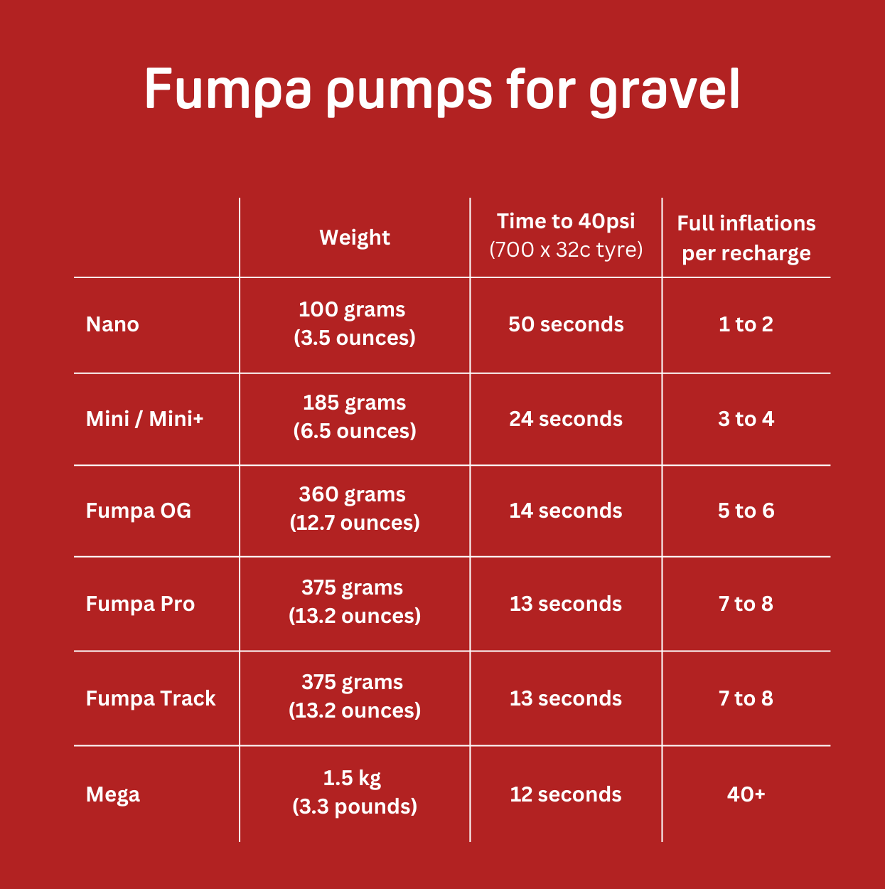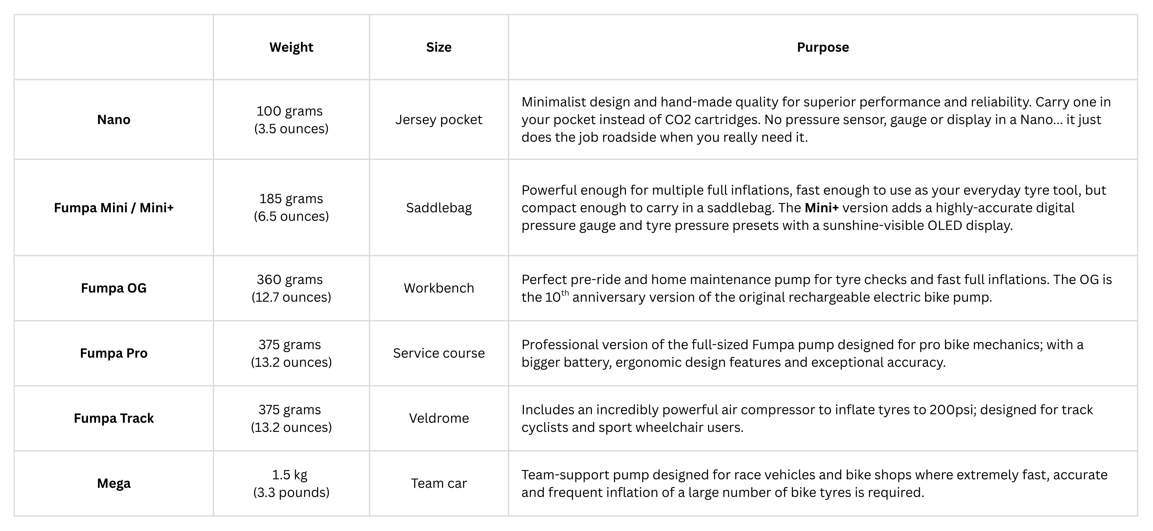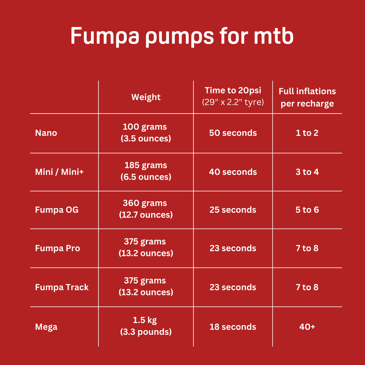 This table will help you directly compare the pumps in the Fumpa range so you choose the right one for your type of riding.